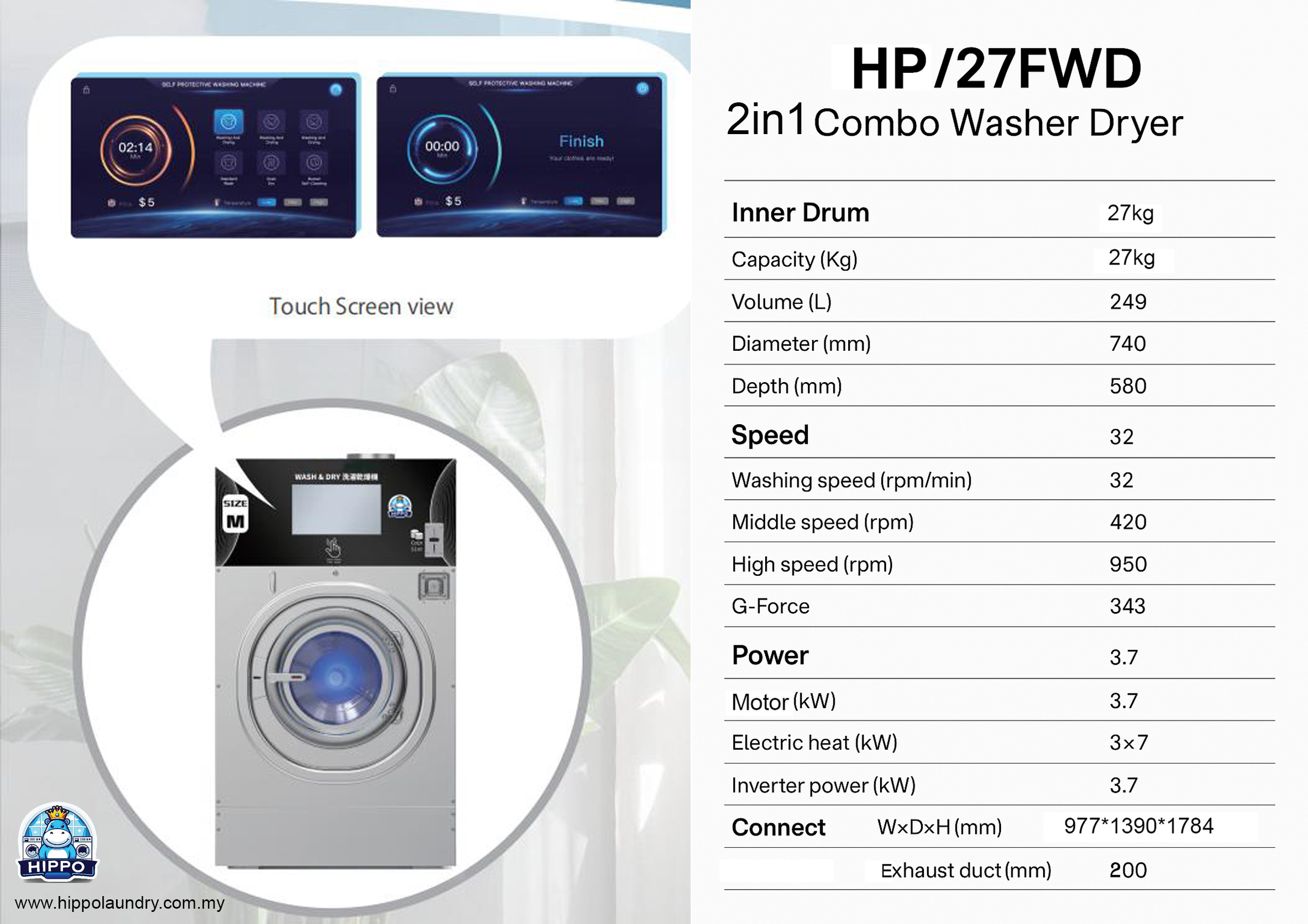 The Hippo 2-in-1 Combo Washer Dryer is a next-generation laundry solution that combines powerful washing and efficient drying into one intelligent system. Designed for commercial use—including hotels, laundromats, and service centers—this 27kg capacity unit delivers exceptional performance, durability, and convenience.