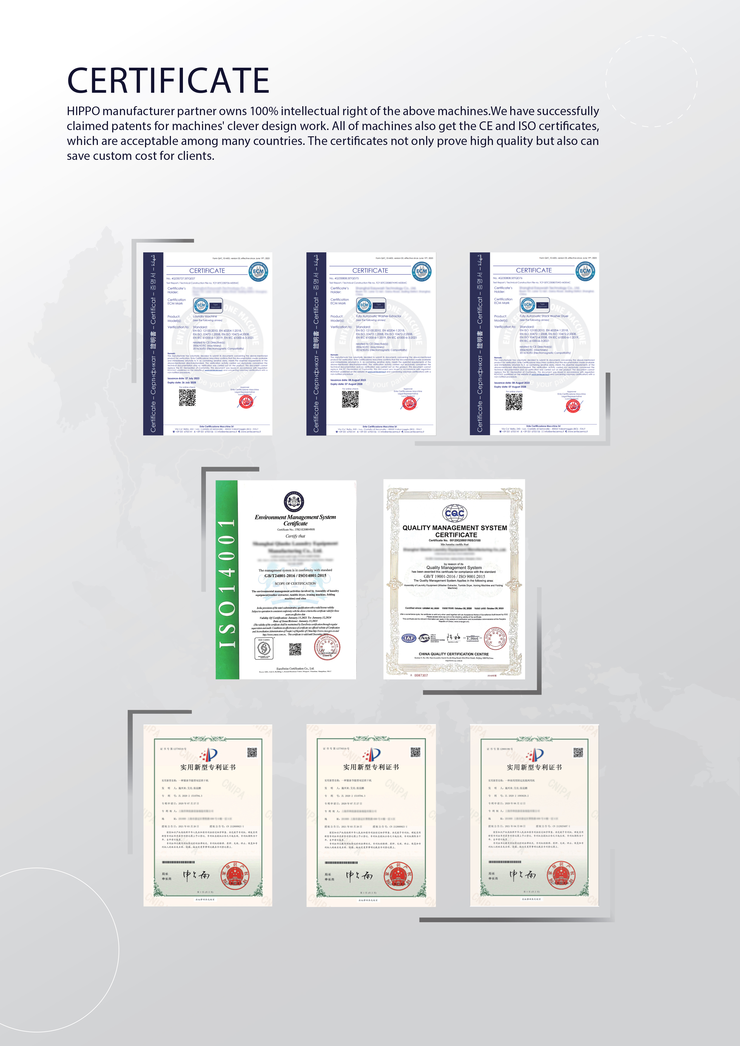HIPPO manufacturer partner owns 700% intellectual right of the above machines. We have successfully claimed patents for machines' clever design work. All of machines also get the CE and ISO certificates, which are acceptable among many countries. The certificates not only prove high quality but also can save custom cost for clients.